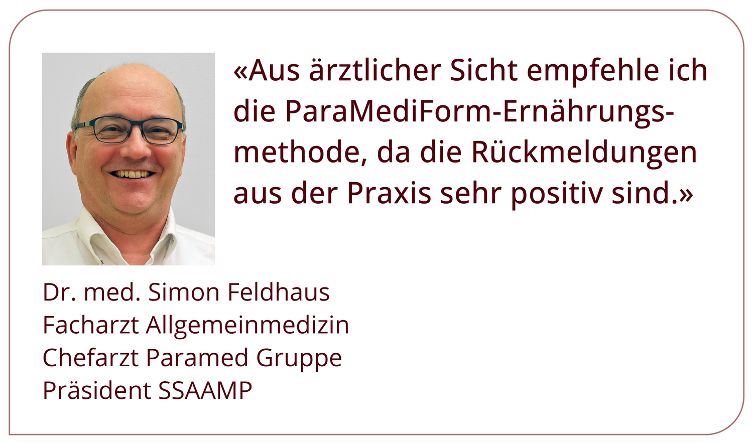 «Mit ParaMediForm habe ich endlich zu einem gesunden Körpergewicht gefunden, ohne Verzicht, ohne Heisshunger, ohne Produktezwang. Meine Berater haben mir aufgezeigt, wie ich meinen Speiseplan abwechslungsreich gestalten kann, sodass ich auch in Zukunft mit viel Freude essen und dabei mein Gewicht halten kann. Für mich ist diese Ernährungsumstellung zu einer neuen Normalität geworden. Ich fühle mich einfach super und empfehle jedem, es gleich zu tun!»